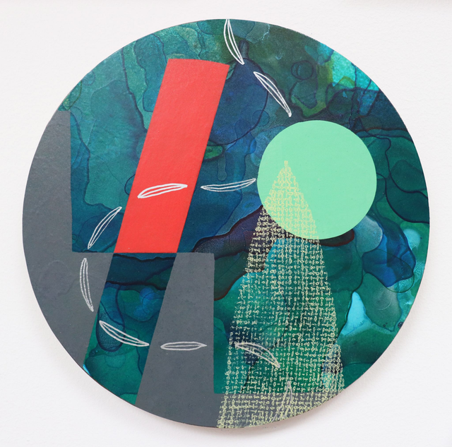 Given Retold, Acrylics, tissue and print on wooden board, 25 cm diameter