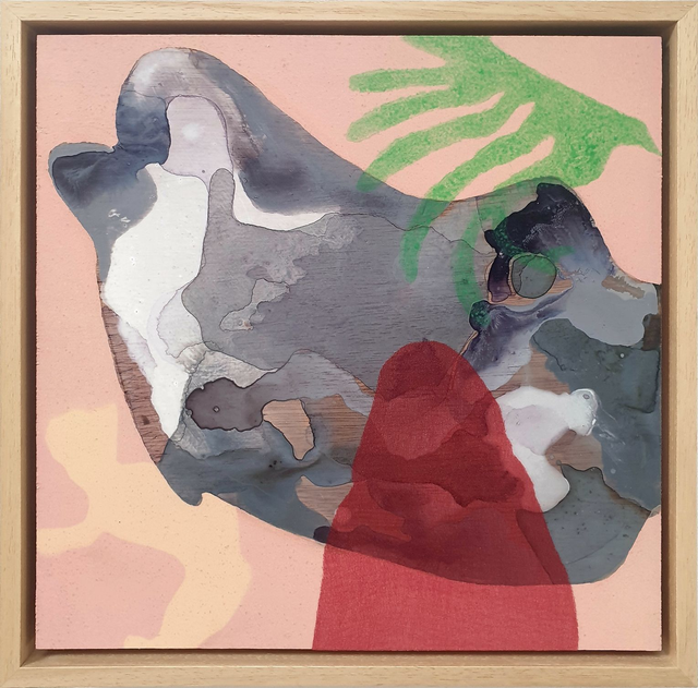 Acrylics, spray paint and fabric on wood